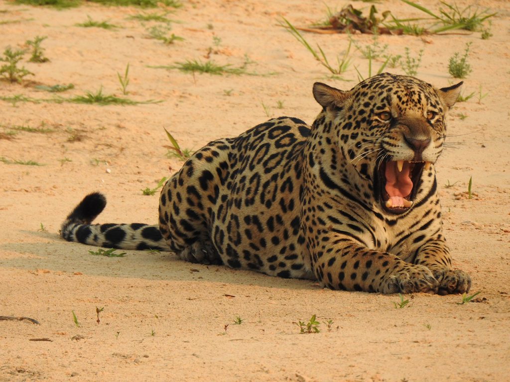 Abfahrt am Morgen in Richtung der „Pousada Paquiri“. Diese „Pousada“ liegt am Rande des Rio Paquiri, einer der Nebenflüsse des Flusses Cuiabá (zwei Stunden mit dem Boot von Porto Jofre), in einen Gebiet, wo der Jaguar normalerweise lebt. Um den Jaguar zu treffen, sollten wir die Transpantaneira (die berühmte Schotterstraße, die das Nordpantanal 150 km entlang führt) durchfahren, dann nehmen wir ein Boot, das uns ein paar Stunden durch den Fluss Cuiabà bis zur Pousada führen wird, wo wir unser Gepäck verlassen und zu Mittag essen werden. Der Rest des Tages wird der Suche des Jaguars vollständig gewidmet.